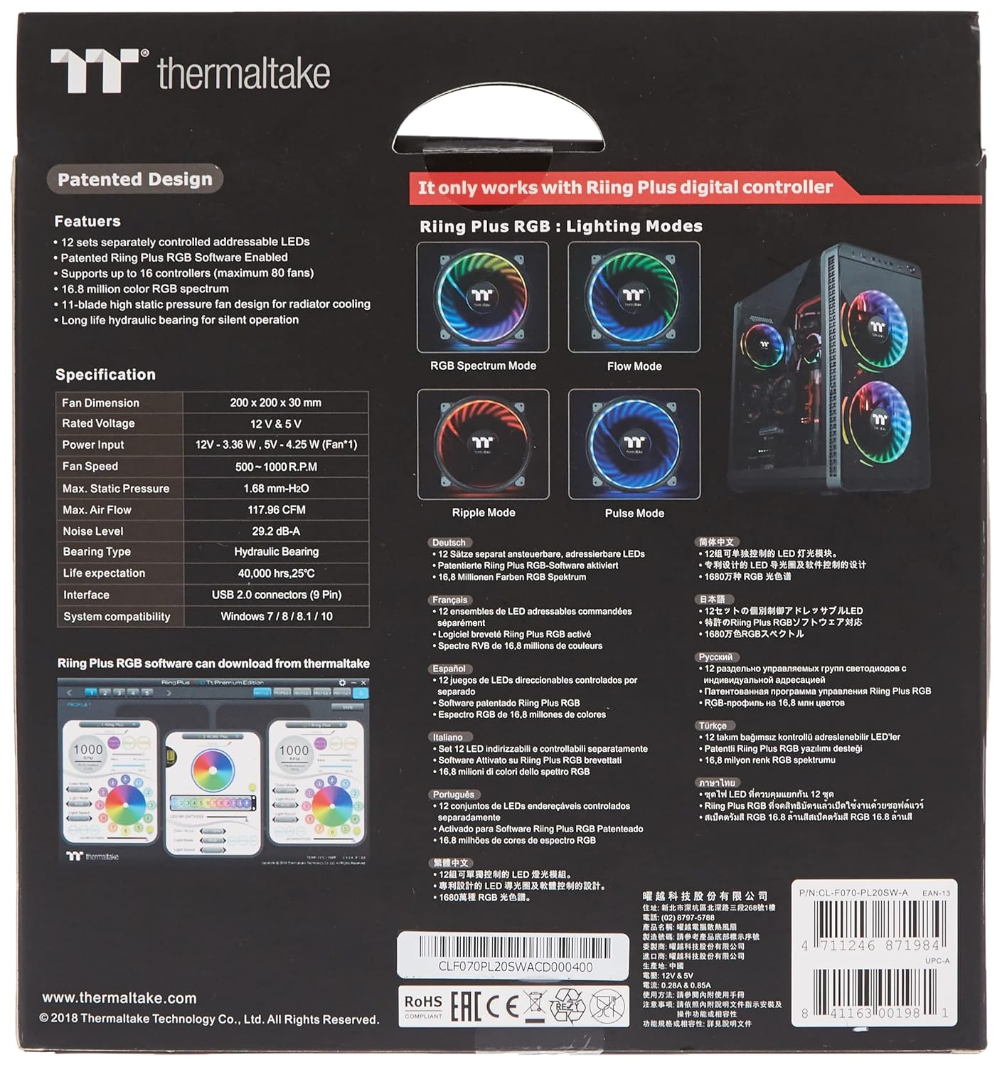 ✅Désignation : THERMALTAKE RIING PLUS 20 RGB – VENTILATEUR BOÎTIER 200 MM – ARGB – HAUTE CIRCULATION – BLACK