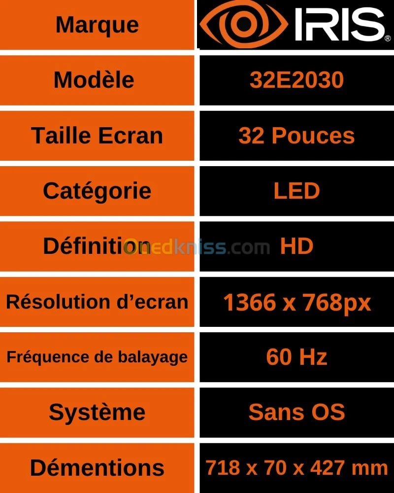 ✅Désignation : TV IRIS E2030 32″ POUCES – LED HD BASIC – FLICKER FREE – DOLBY AUDIO- 16:9 60HZ – HDMI / USB -BLACK